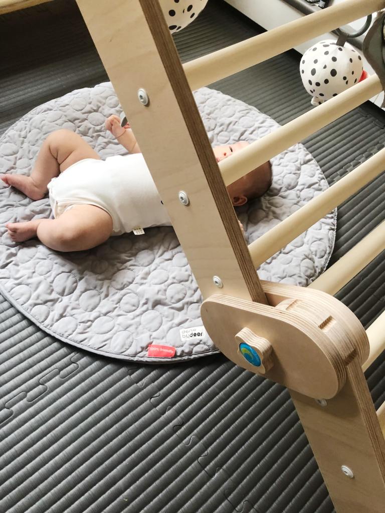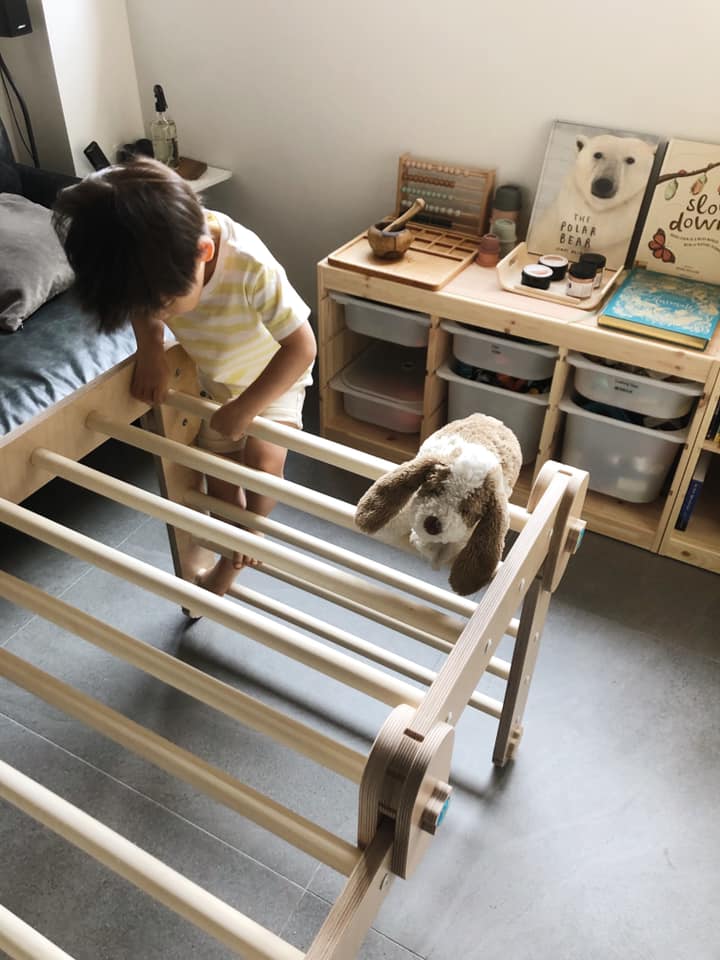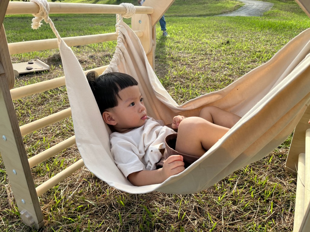 雖然家中的小嫩嬰還無法爬,某次看到歐美的媽媽都會把玩具、布偶,懸掛在攀爬架上,立刻就變身成一座嬰兒健力架,對於新生兒來說是很好的視覺刺激,也會吸引嬰兒試圖伸手去抓、握。