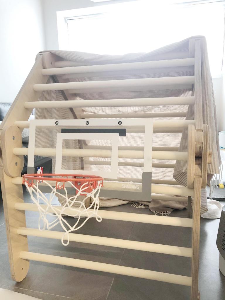 這是我們家自創的玩法,把籃球框掛上去,就成了麥麥最愛的投球時間!