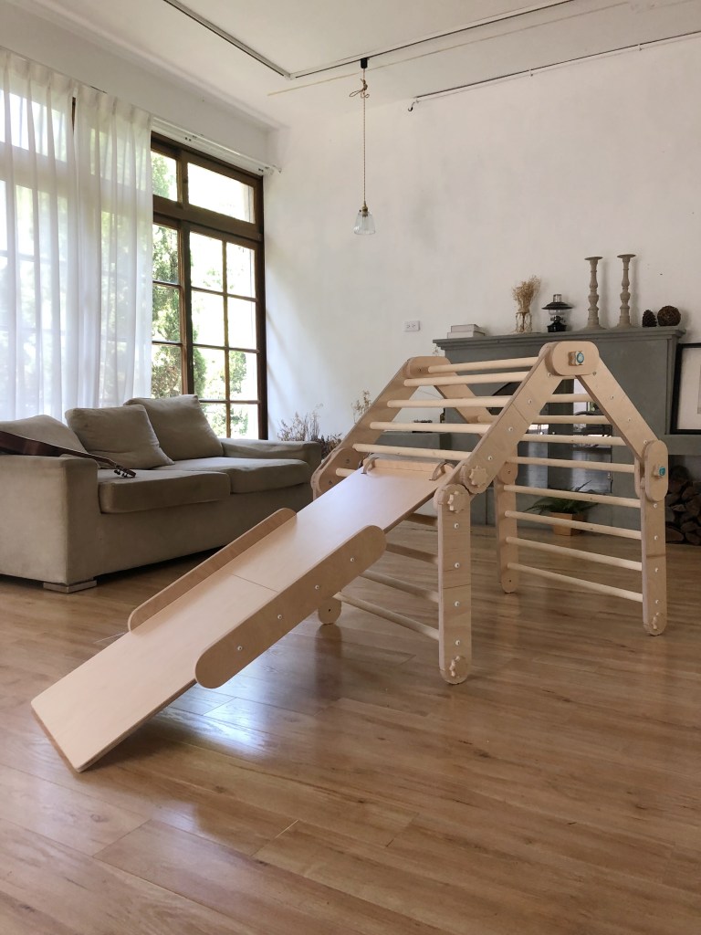 這個是每個孩子最愛的,一面是溜滑梯,一面是攀岩石。我同時購入了兩組溜滑板,可以擺放在攀爬架的不同位置,能變化出更多玩法。像是從一端用攀岩面爬上去,爬過攀爬架後,再從另一端用溜滑梯的方式溜下來。
