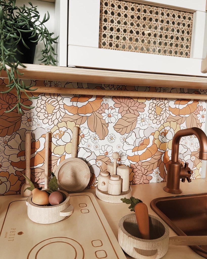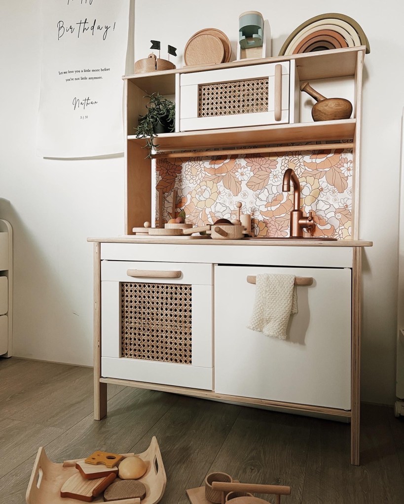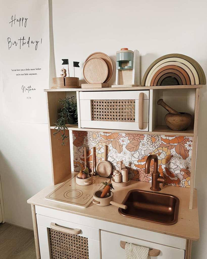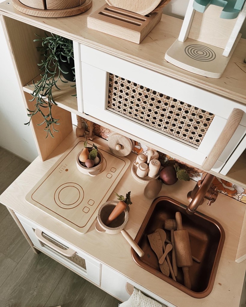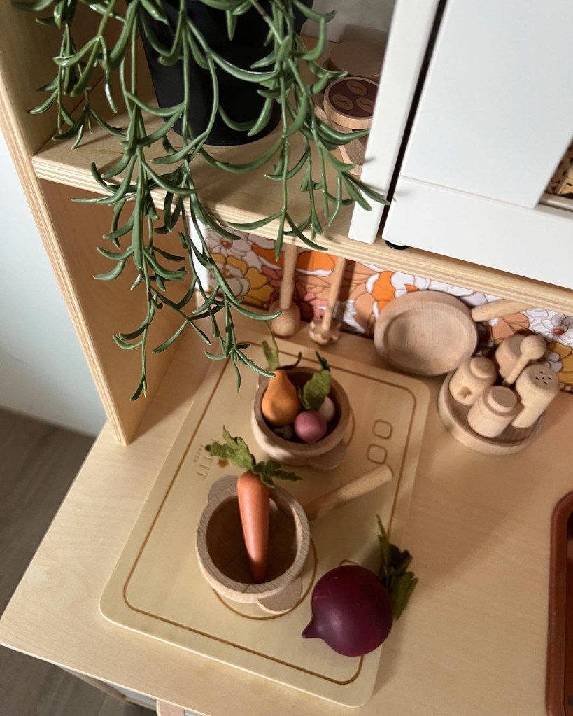 7. 最後,擺上木頭玩具、玩具蔬果也是個大重點,好看的木玩能讓原本便宜的廚房大加分,再擺上一盆人造盆栽就更有生活感了!