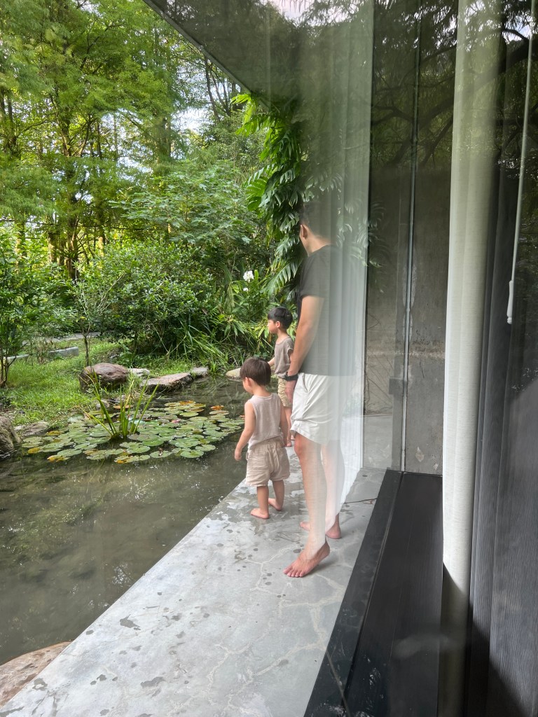 四人房的生態水景房是邊間,走進房間後,打開落地窗外就有轉角型的生態水池環繞。